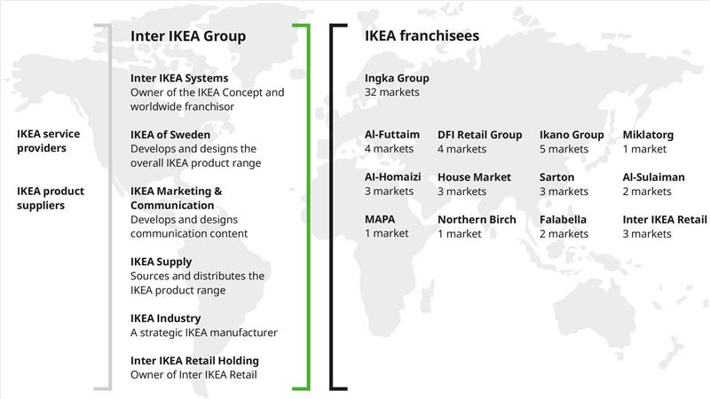 IKEA is a franchise business. That means that many groups of companies work together under one IKEA brand.